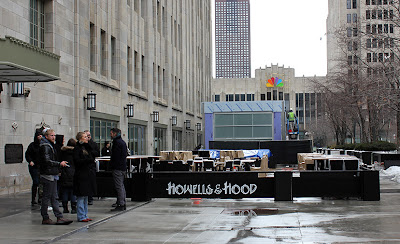 Workers are putting finishing touches on a new restaurant, Howells & Hood, named after the architects of Tribune Tower. Raymond Hood, who also led the design team on Rockefeller Center in New York, died in 1934. His partner John Mead Howells died in 1959. Which is probably for the best, since there's a good chance if they weren't dead already, the huge glass and metal box that's now popped up next to their faux Gothic tower would send them to their graves, so they could spin in them.